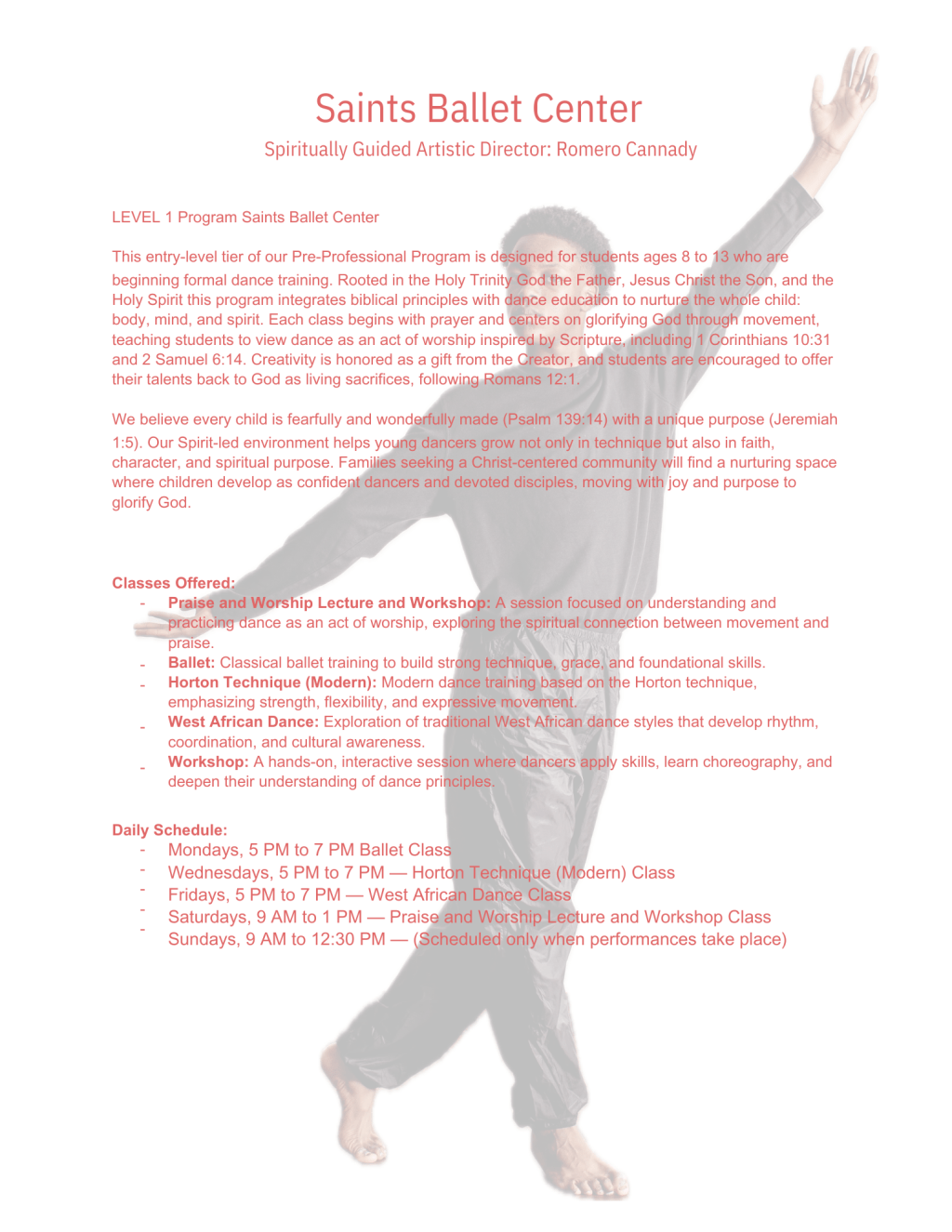 This entry-level tier of our Pre-Professional Program is designed for students ages 8 to 13 who are beginning formal dance training. Rooted in the Holy Trinity God the Father, Jesus Christ the Son, and the Holy Spirit this program integrates biblical principles with dance education to nurture the whole child: body, mind, and spirit. Each class begins with prayer and centers on glorifying God through movement, teaching students to view dance as an act of worship inspired by Scripture, including 1 Corinthians 10:31 and 2 Samuel 6:14. Creativity is honored as a gift from the Creator, and students are encouraged to offer their talents back to God as living sacrifices, following Romans 12:1.