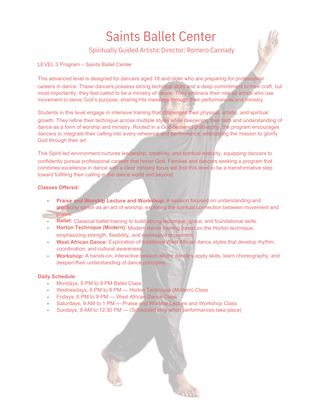 Students in this level engage in intensive training that challenges their physical, artistic, and spiritual growth. They refine their technique across multiple styles while deepening their faith and understanding of dance as a form of worship and ministry. Rooted in a God-centered philosophy, the program encourages dancers to integrate their calling into every rehearsal and performance, embodying the mission to glorify God through their art.